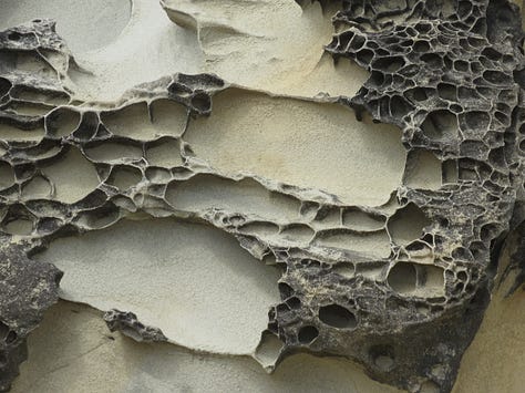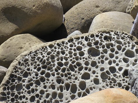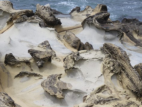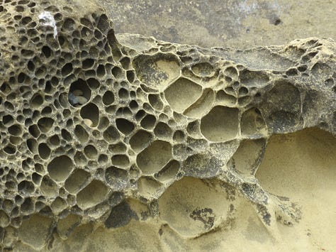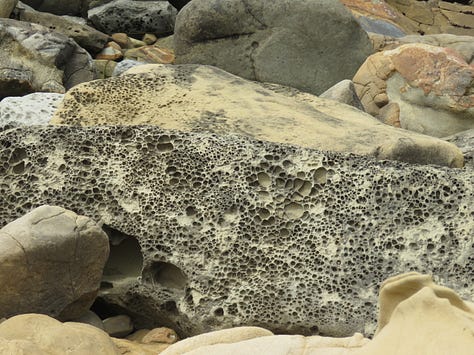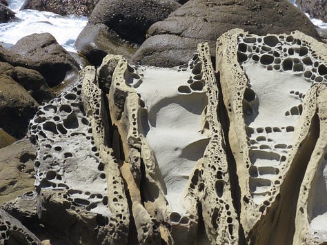 Intricate tafoni rock, with its honeycomblike erosion, is created in the cliffs and crevices by the constant wet and dry conditions occurring in the beige- to orange-colored sandstone. Tafoni, or “cavern” in Italian, shows up as thousands of ridges, holes and knobs in the earth here. There appears to be no end to the designs created from the interaction of sand and salt spray as it erodes rock over time.