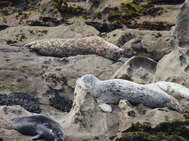 Harbor seals can be colored dark with Dalmatianlike spots or white with black spots. These chunky sea creatures consume an assortment of fish such as flounder, herring, hake and lampreys as well as cephalopods such as octopus and squid. Between December and April be sure to watch for gray whales as they migrate to their breeding/calving districts south to Baja California. In the summer months they return north to the feeding areas in the Bering Sea.