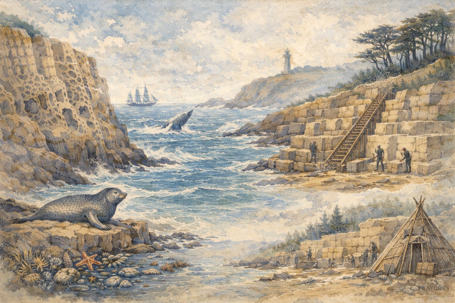 Not long after the lumber operations, there was once a rock quarry located here. Evidence of the quarried sandstone can be found along the north side of Gerstle Cove. it is possible to see where the quarrying activity took place since workers utilized rock hammers and other tools in the creation of large blocks of sandstone. Workers hammered the rock face to allow the stone to be disassembled, then loaded into schooners.