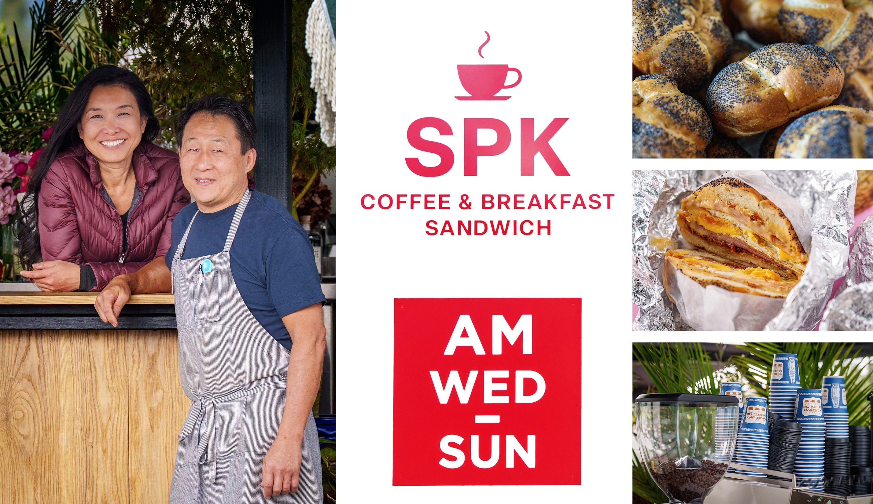By midmorning, a line has begun to form at the open-air counter, the sound of traffic blending with the hiss of steaming milk. Cars and trucks hum past as husband-and-wife team Heidy He and Chef Joshua Smookler move through their routine at SPK, which they own and operate together along with Golden Bear Station. Outside, Heidy makes coffee for guests who sit at pink tables beneath green umbrellas, sipping lattes from blue paper cups printed with “We Are Happy to Serve You.” Inside, Smookler works the griddle alone most mornings, moving with quiet precision. He toasts the roll, cracks the egg, turns the bacon once, melts the cheese and folds each sandwich into paper and foil. Every motion is deliberate.